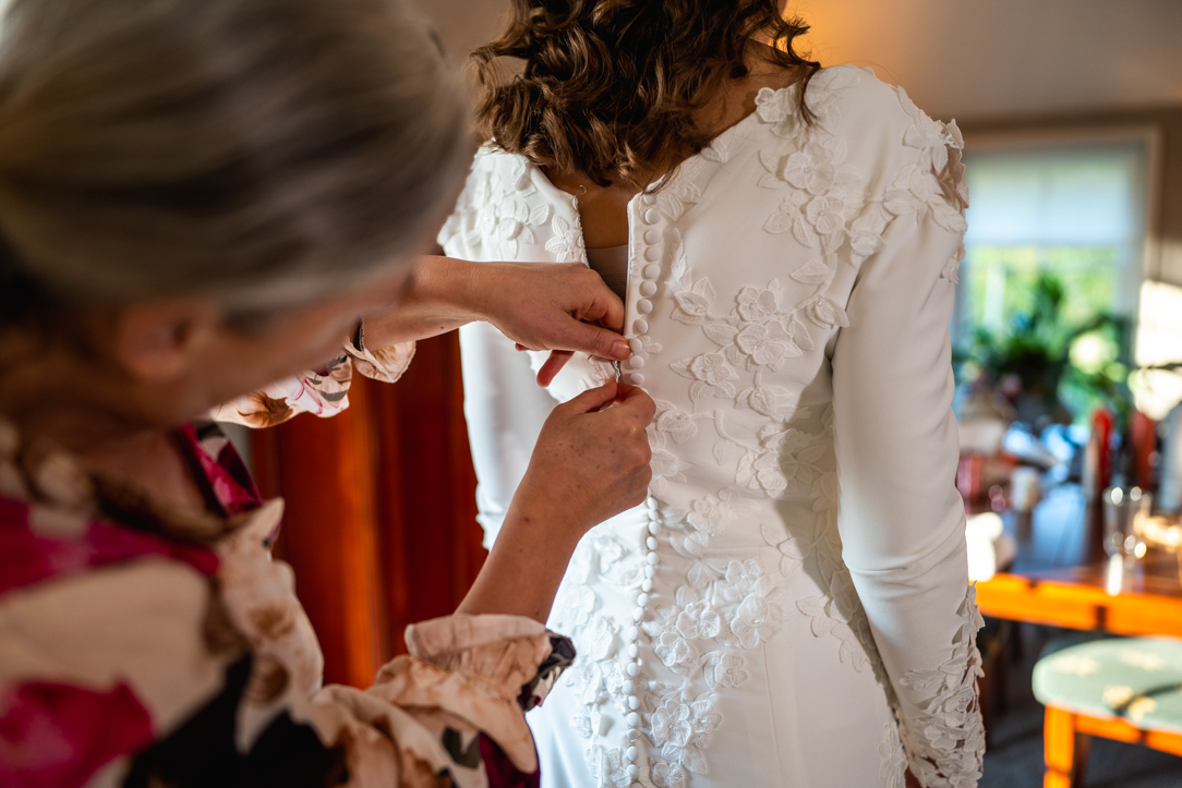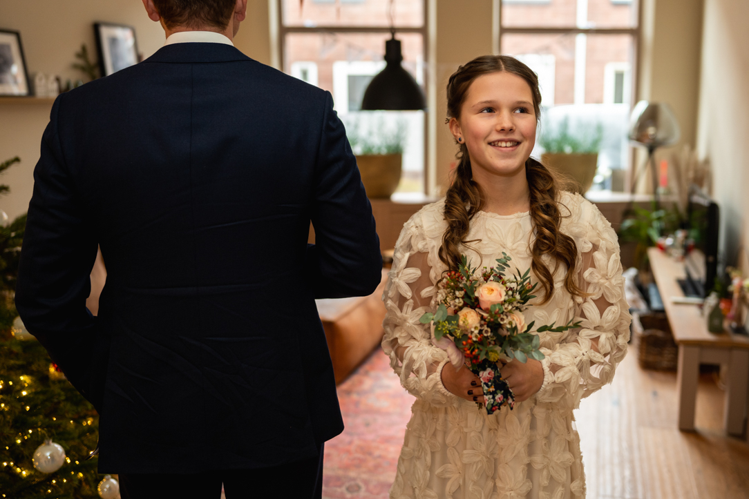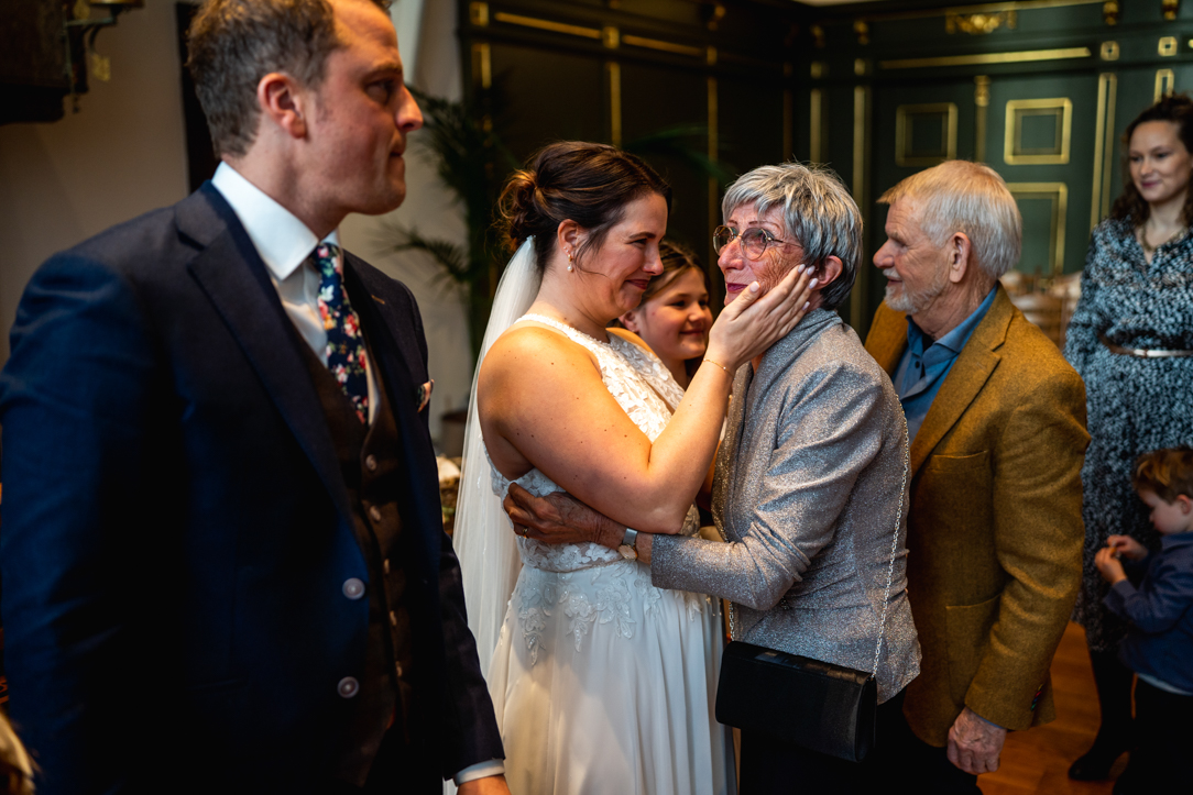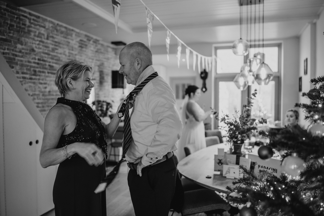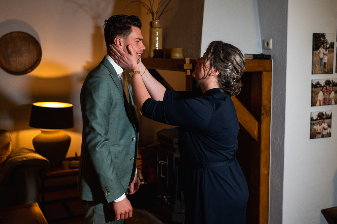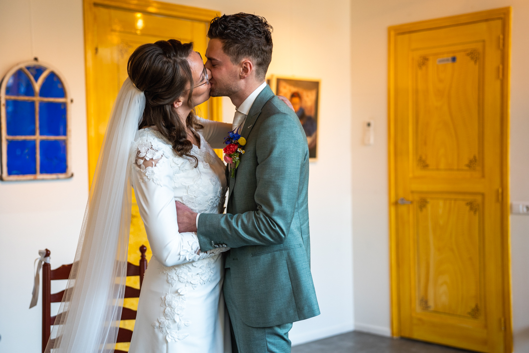 Na de eerste voorbereidingen vertrok ik richting Staphorst, waar Rosanne zich klaarmaakte bij haar ouders thuis. Daar vond ook hun first look plaats. Een bijzonder en intiem moment, midden in een vertrouwde omgeving. Samen met de mensen die dicht bij hun staan! De emoties waren puur, oprecht en precies zoals je hoopt dat ze zijn op zo’n dag!