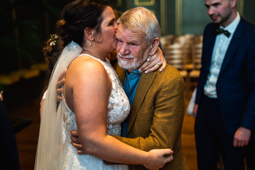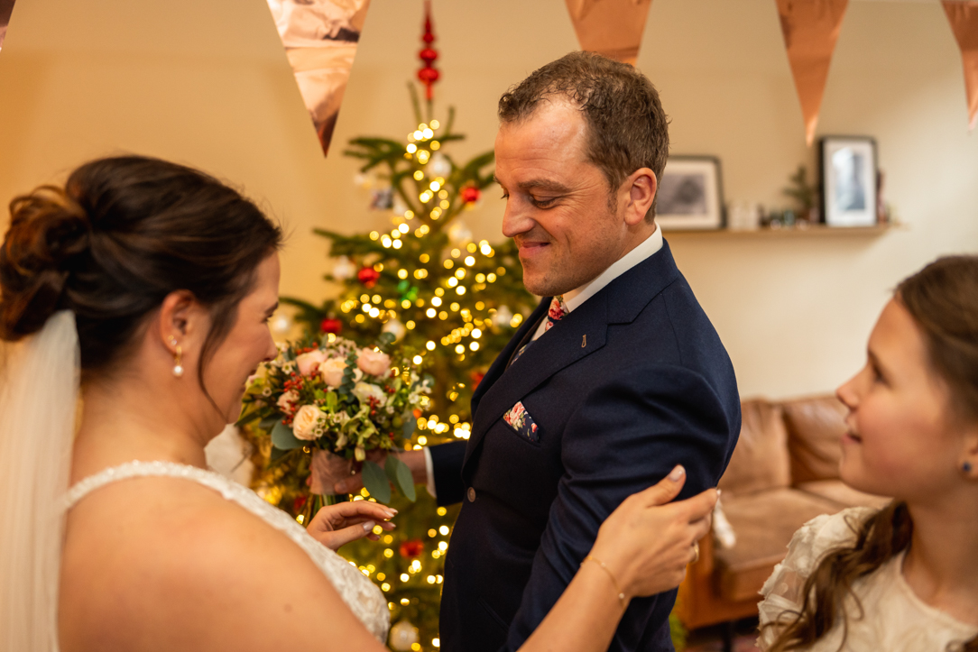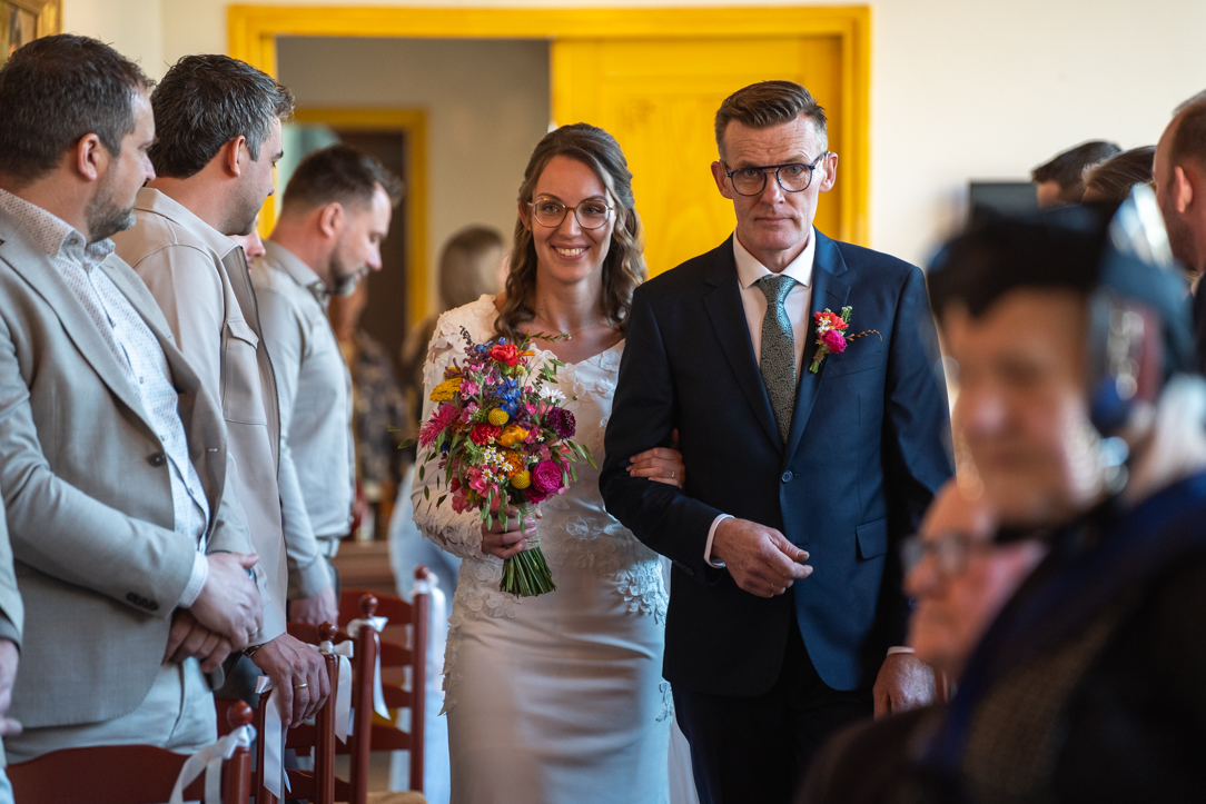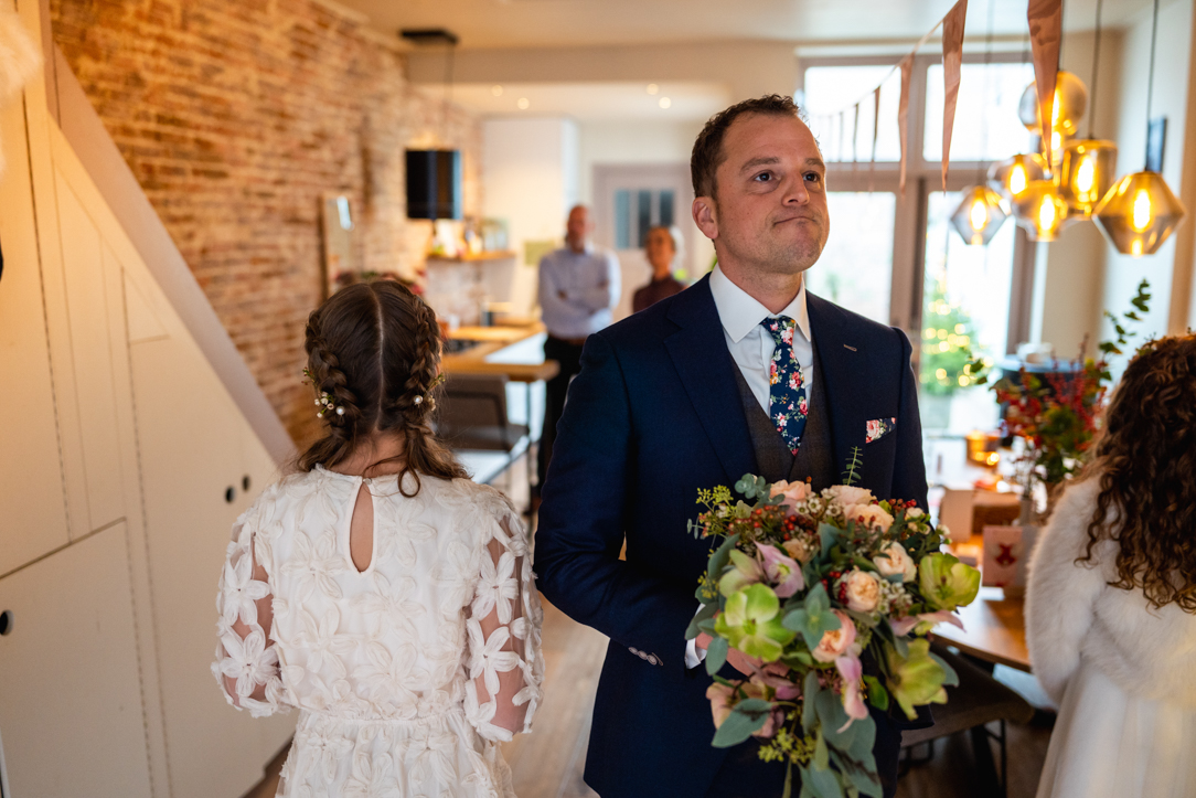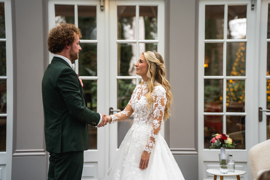 Na de eerste voorbereidingen vertrok ik richting Staphorst, waar Rosanne zich klaarmaakte bij haar ouders thuis. Daar vond ook hun first look plaats. Een bijzonder en intiem moment, midden in een vertrouwde omgeving. Samen met de mensen die dicht bij hun staan! De emoties waren puur, oprecht en precies zoals je hoopt dat ze zijn op zo’n dag!
