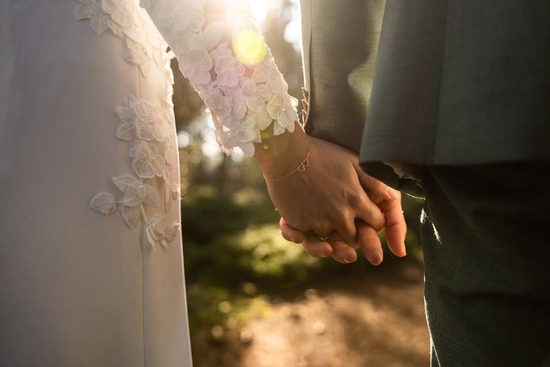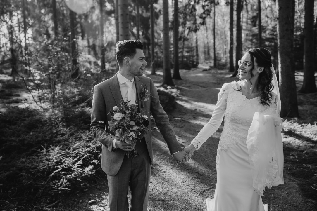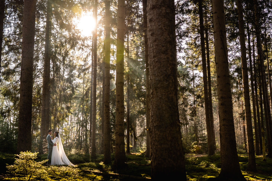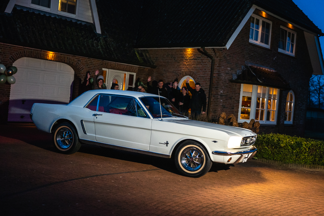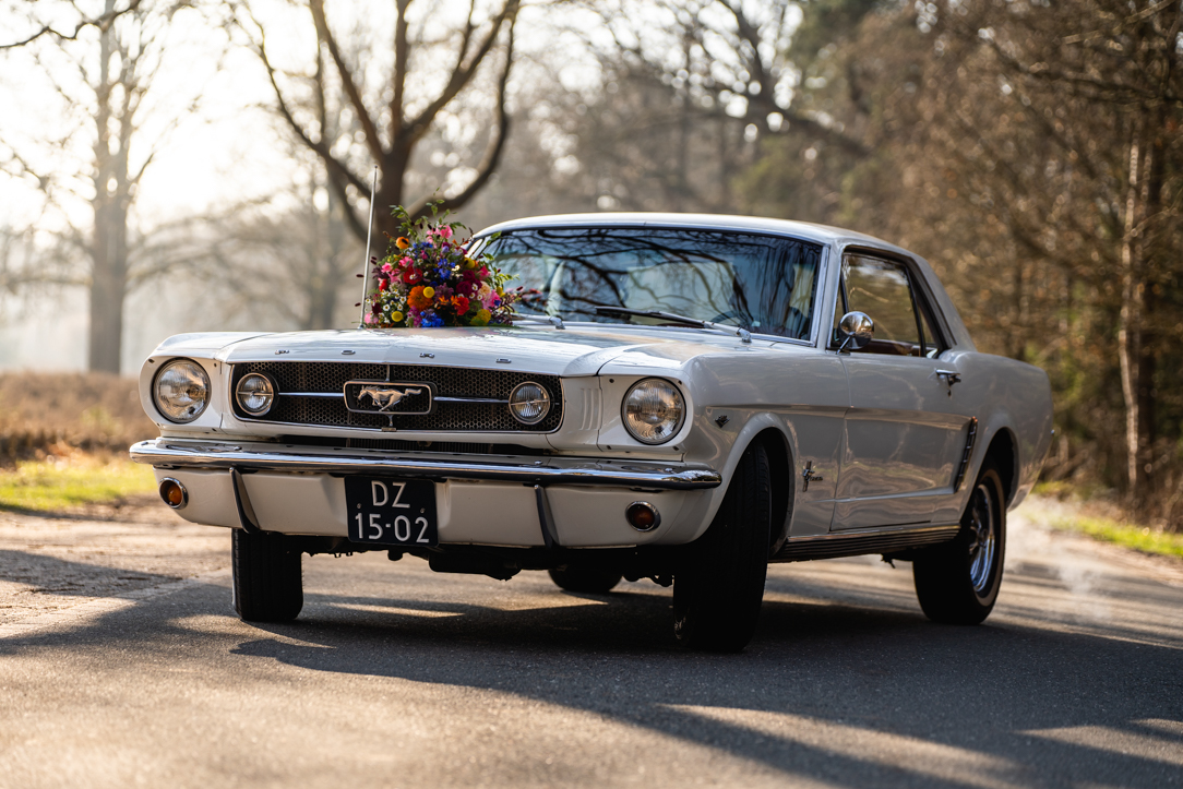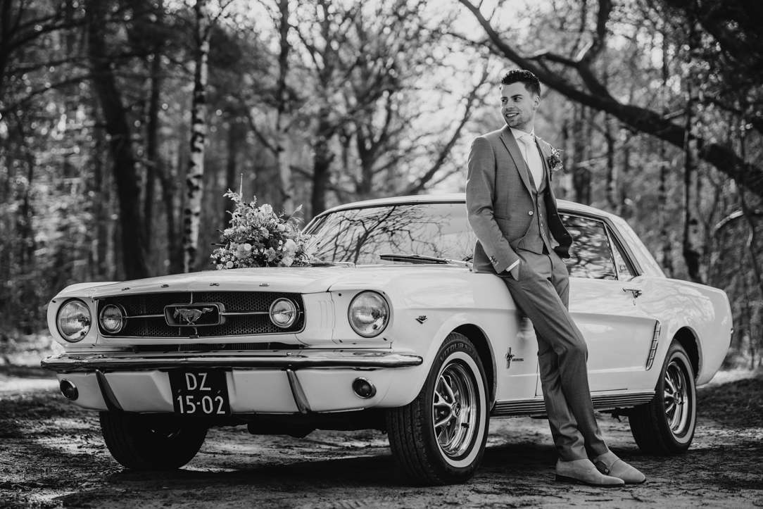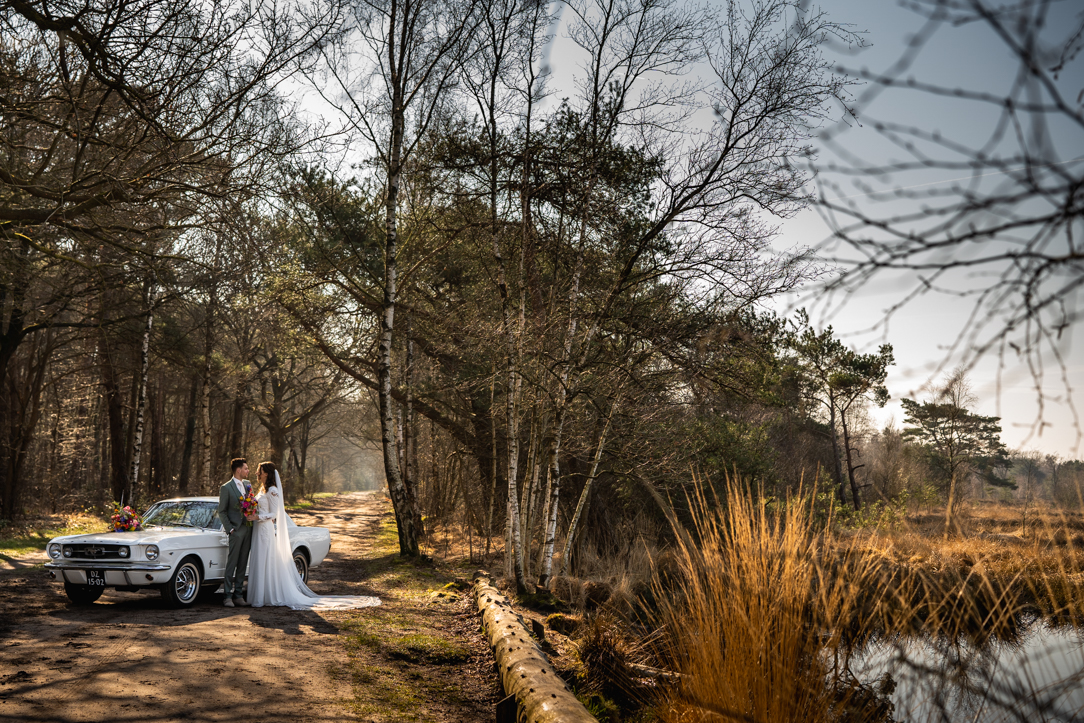 Na de first look stapten we in een prachtige Mustang – een echte eyecatcher – en reden we richting het Staphorsterbos. De combinatie van natuur, rust en het stijlvolle karakter van de auto zorgde voor een unieke setting. Het bos gaf ons alle ruimte voor spontane momenten en romantische beelden, precies zoals het bij Geerten & Rosanne past!