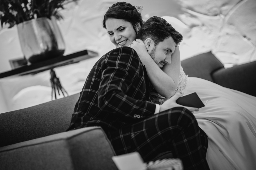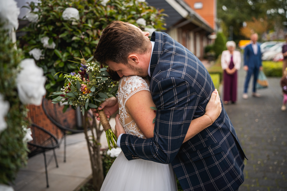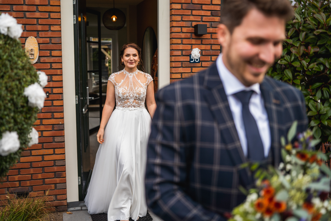 Bij de voordeur vond de first look plaats. Een plek die misschien al talloze dagelijkse momenten heeft gezien, maar vandaag gevuld werd met pure emotie. Zodra Rutger Rianne zag, viel alles op z’n plaats. Tranen, een knuffel, een blik die alles zei — een van die momenten waarvan je als fotograaf weet: ja, dit is waarom ik doe wat ik doe! Als je al vaker wat blogs gelezen hebt, of in gesprek geweest zijn; dat weet je dat de first look voor mij één van de hoogtepunten van de dag is om vast te leggen!