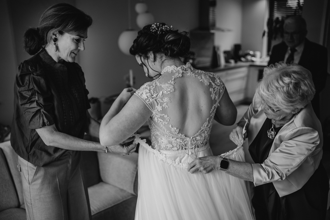 Rianne begon haar ochtend in hun eigen huis, omringd door dierbaren. Met hulp van haar vader en moeder werd haar prachtige jurk aangetrokken – een prachtig en uniek moment!